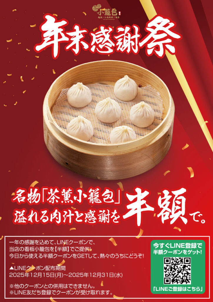 この度、お客様への今年の感謝を込めまして、LINE友だち限定で「年末大感謝祭!名物『茶薫小籠包 6個』半額LINEクーポン」を配布いたします。